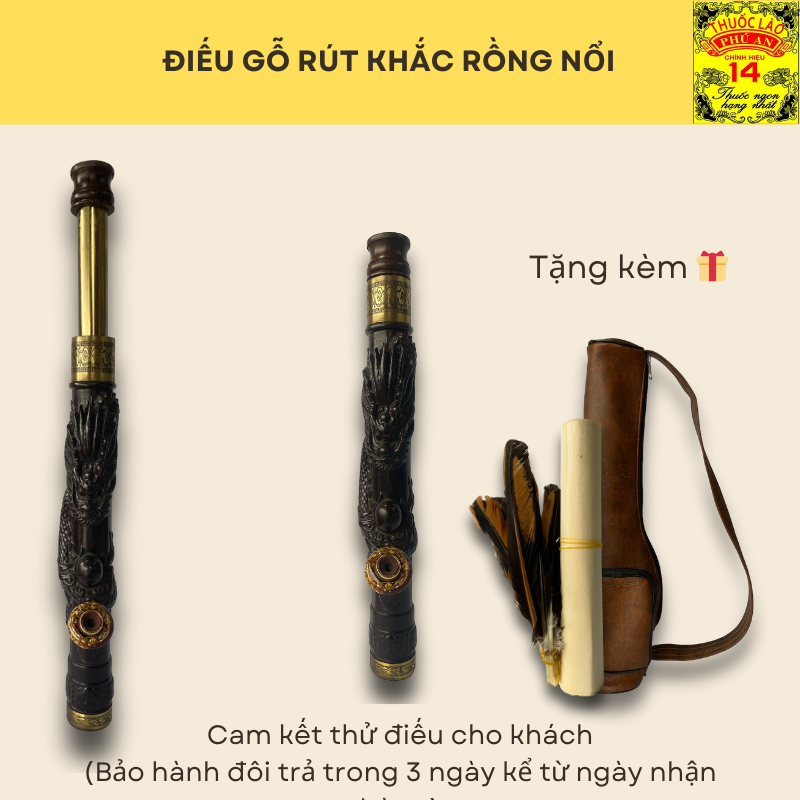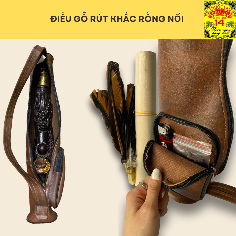 ĐIẾU GỖ RÚT KHẮC RỒNG NỔI (kèm bao da – Tặng combo lông gà đóm)