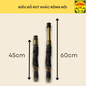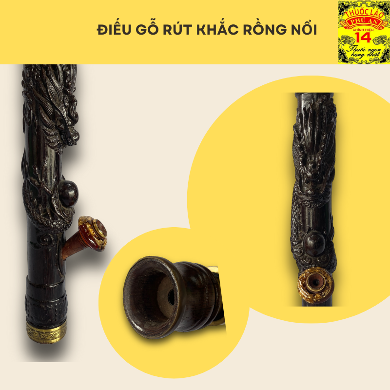 – Chất liệu: Thân điếu được chạm khắc bằng gỗ với hoạ tiết rồng cuộn ngọc. Lõi điếu bên trong được làm bằng inox, có thể rút ra tăng chiều dài của điếu.